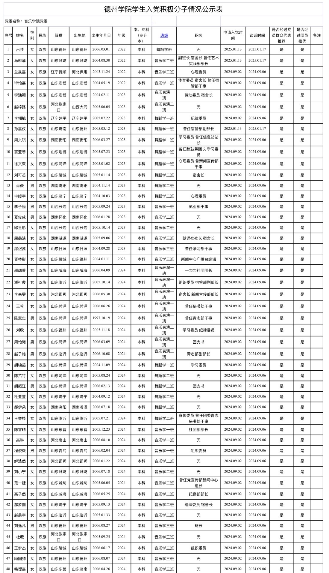 经党组织培养考察,通过党员、群众代表无记名投票推荐和团员推优,支委会讨论研究、党委审查,确定吕佳等48人为入党积极分子。为增强发展党员工作的透明度,接受党内外群众的监督,确保党员后备队伍的质量,根据上级文件精神和《中共德州学院委员会发展党员工作实施细则》的要求,现将新确定入党积极分子的基本情况公示如下(详见附表):