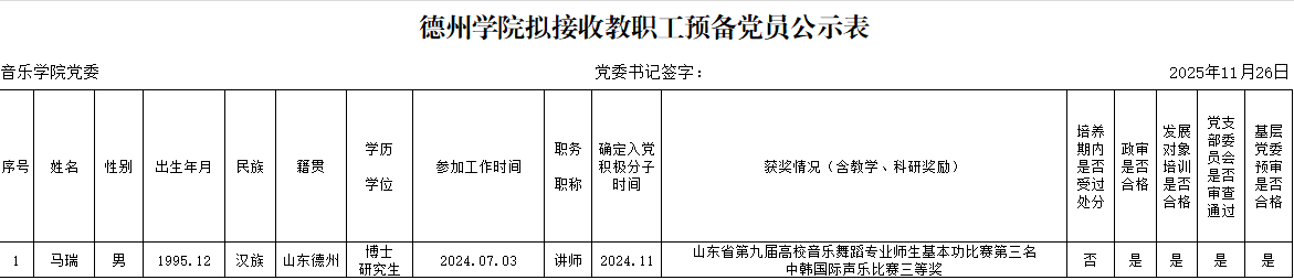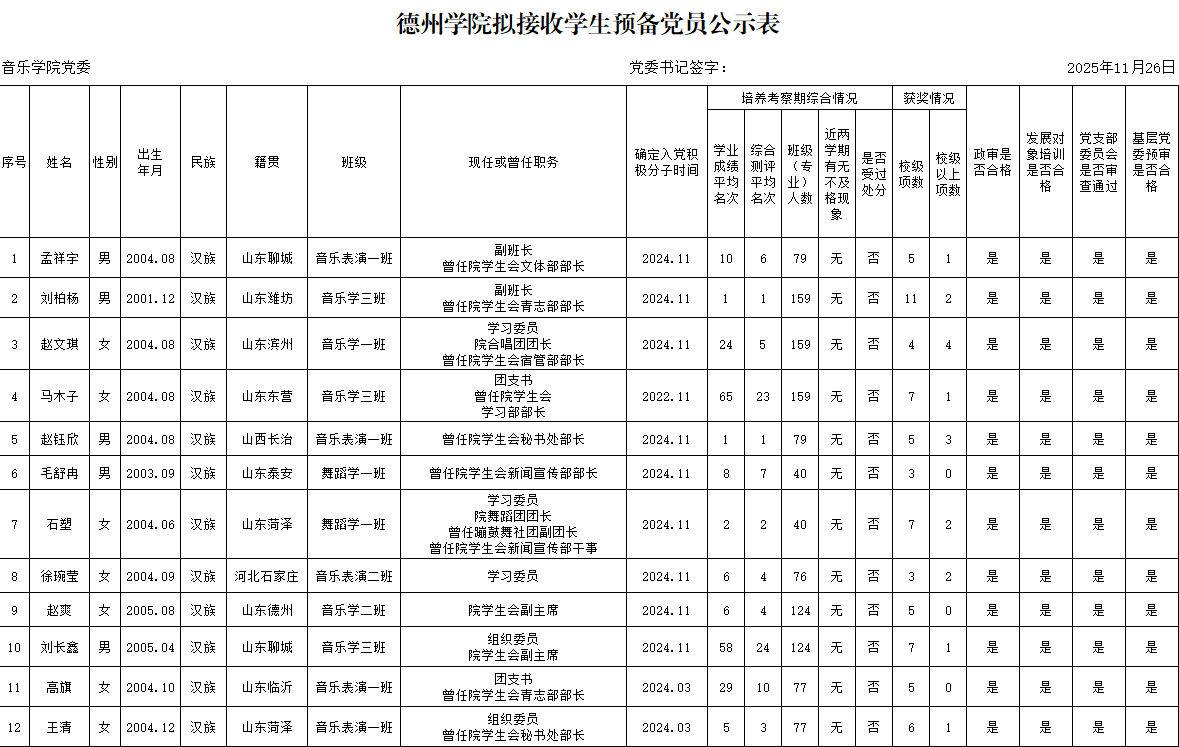经党组织培养考察,征求党员、群众和培养联系人意见,支委会讨论研究、政治审查、集中培训、基层党委预审,拟接收孟祥宇等13名同志为中共预备党员。为增强发展党员工作的透明度,接受党内外群众的监督,确保发展党员的质量,根据上级文件精神和《中共德州学院委员会发展党员工作实施细则》的要求,现将拟接收预备党员的基本情况公示如下(名单附后):