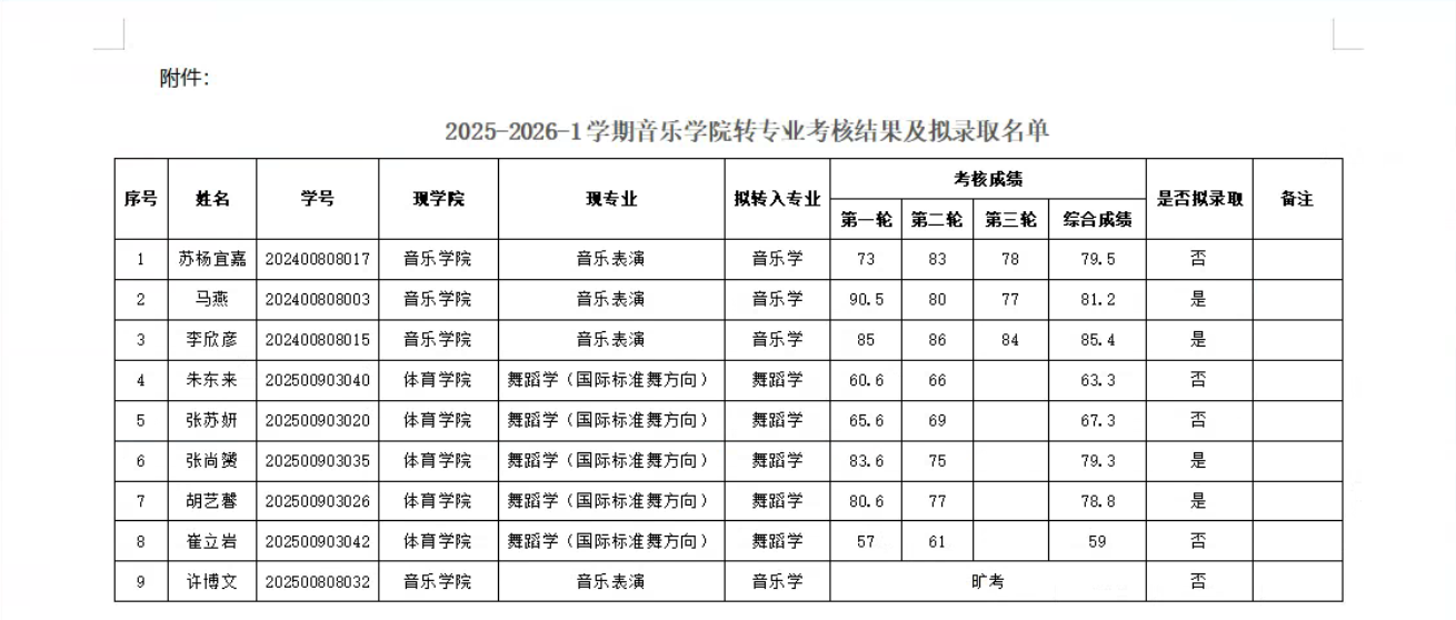 附件:2025-2026-1学期音乐学院转专业考核结果及拟录取名单