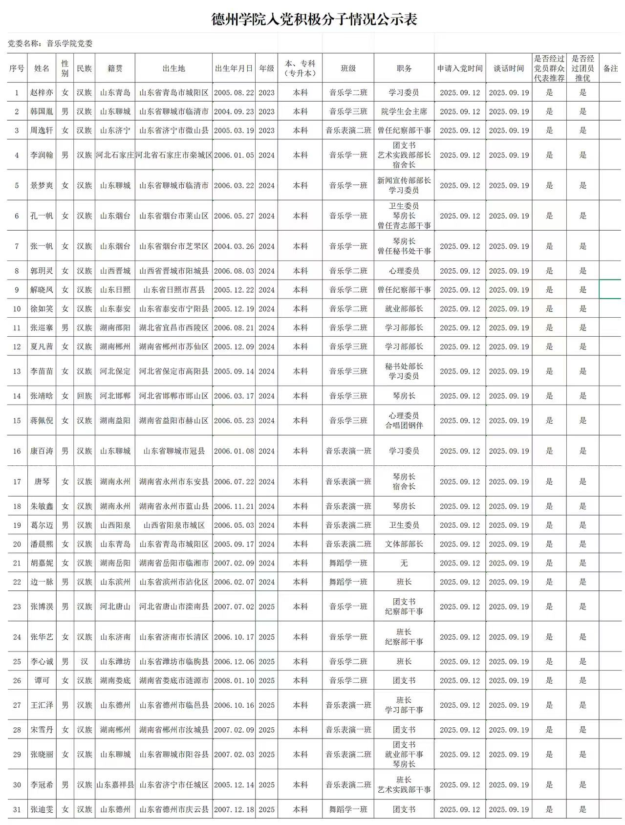 经党组织培养考察,通过党员、群众代表无记名投票推荐和团员推优,支委会讨论研究、党委审查,确定赵梓亦等31人为入党积极分子。为增强发展党员工作的透明度,接受党内外群众的监督,确保党员后备队伍的质量,根据上级文件精神和《中共德州学院委员会发展党员工作实施细则》的要求,现将新确定入党积极分子的基本情况公示如下(详见附表):